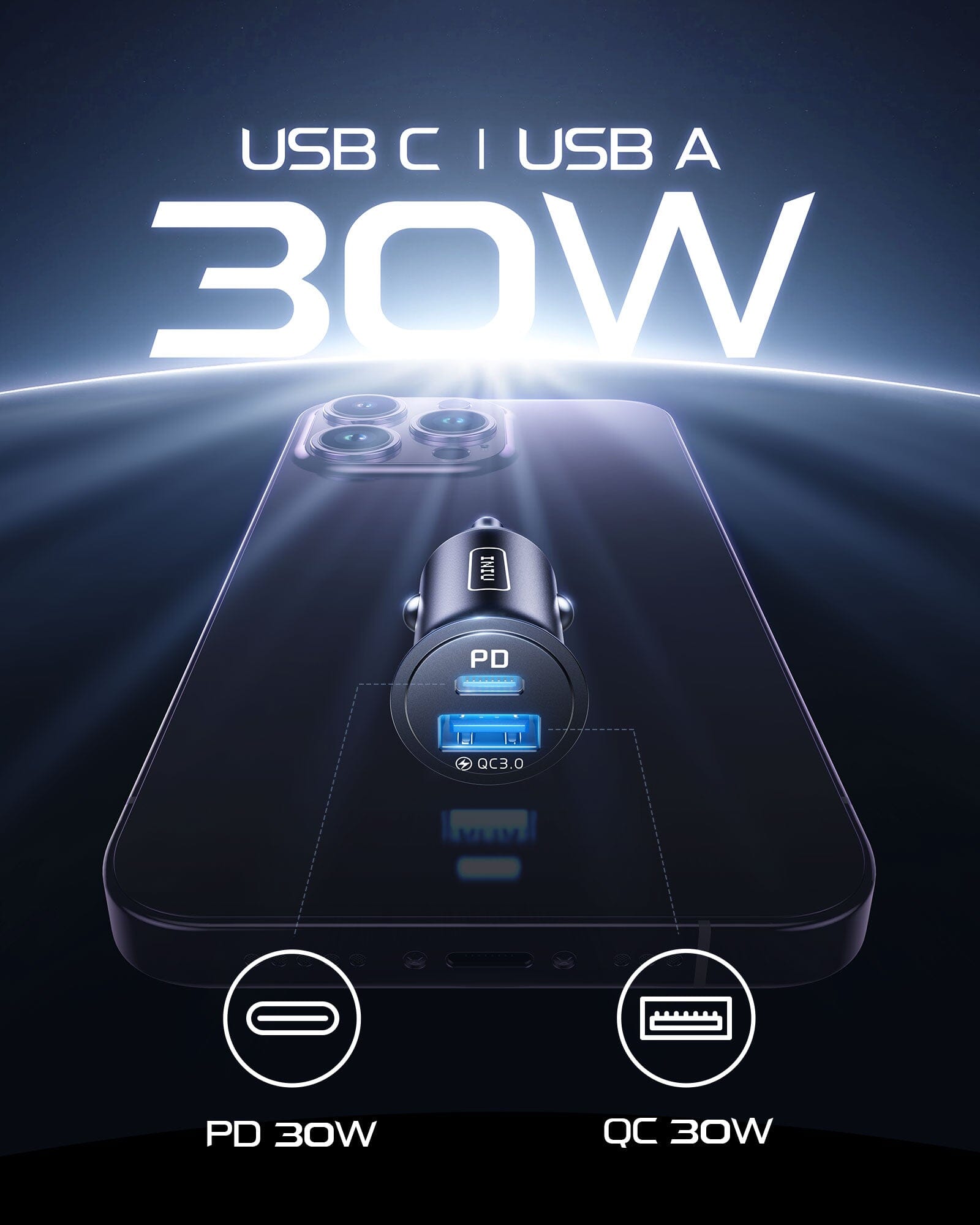 Unlike most car chargers with 2 same USB ports, it features 30W max USB C and 30W max USB ports to fit all devices and charge 2 devices together.