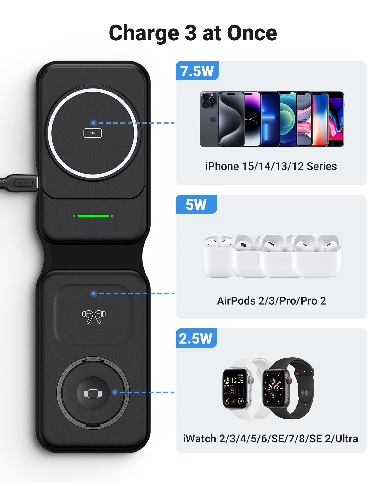 INIU SnapGo WI222 - Base de carga inalámbrica 3 en 1, multifunción magnética de 15 W
