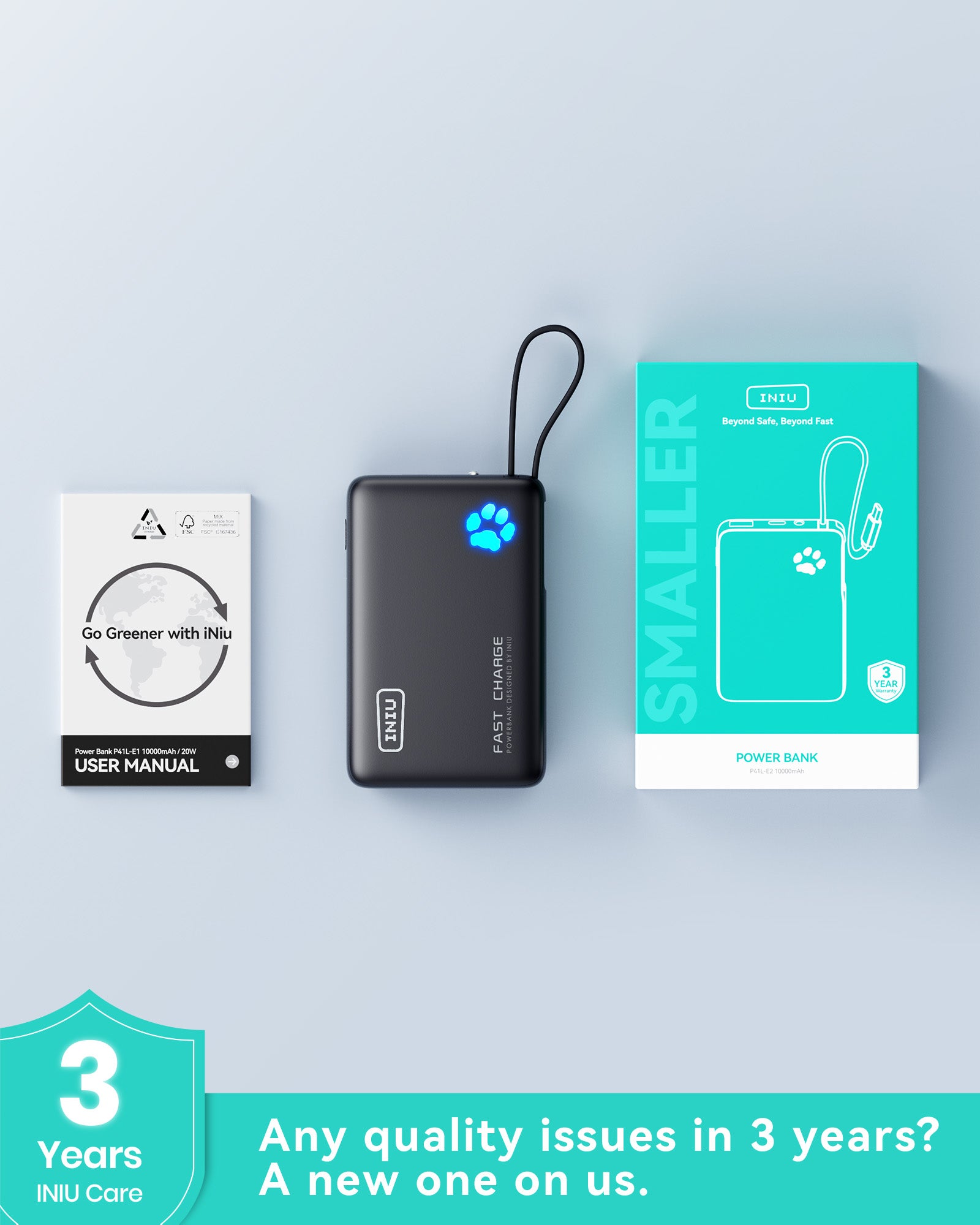 INIU Pawsible P41L-E2 Banco de energía con cable integrado, el más delgado de 45 W y 10 000 mAh