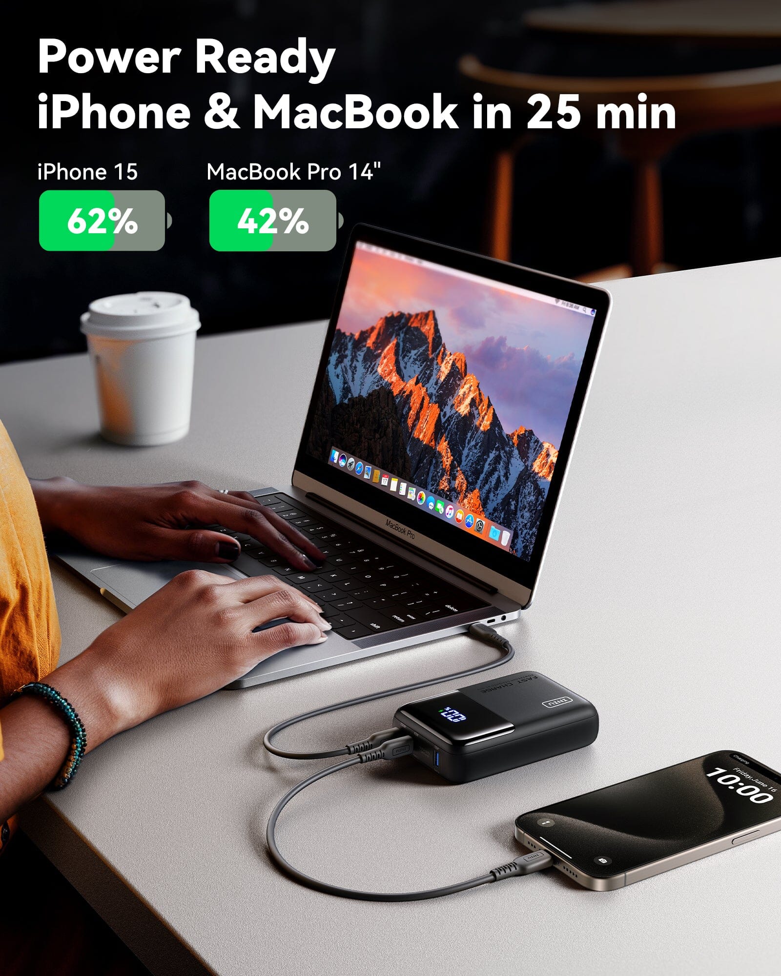 [25分でiPhoneとMacBookを電源オン]複数のデバイスを同時に使用する方に欠かせないこのパワーバンクは、最大110Wの高速充電で2台のデバイスを同時に充電できます。わずか25分で、MacBook Pro 14インチを42%、iPhone 15を62%まで充電できます。