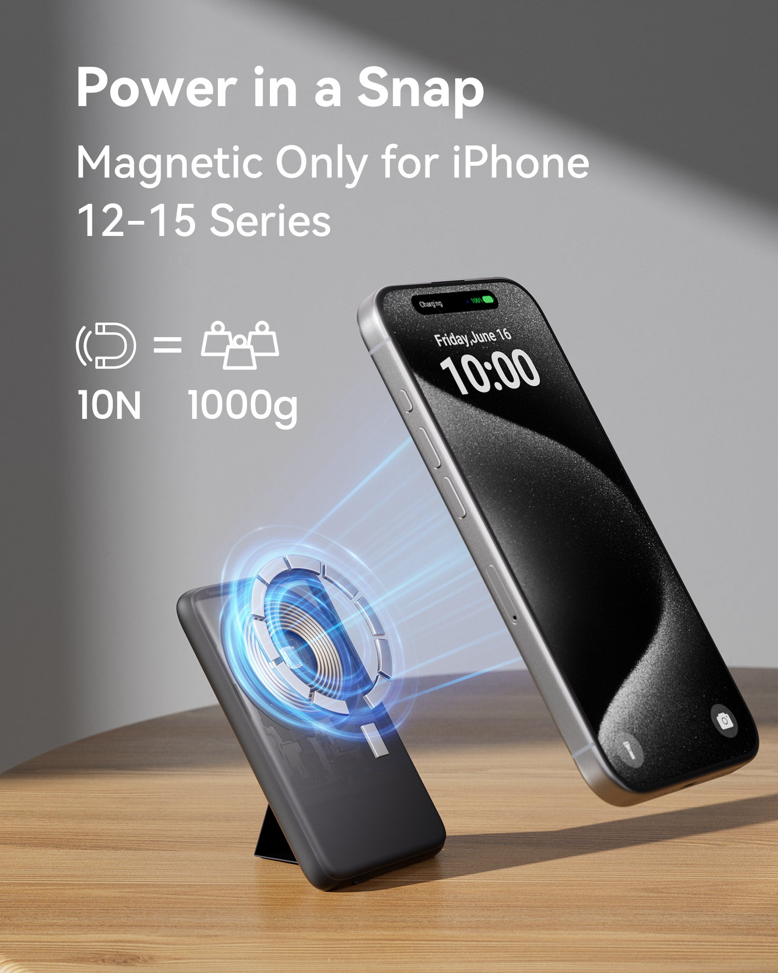 - [Stworzone dla serii iPhone 16/15/14/13/12] Pożegnaj splątane kable i niewygodne ładowanie. Nasz magnetyczny powerbank bezprzewodowy jest dostosowany do technologii MagSafe Twojego iPhone'a, zapewniając bezproblemowe, obsługiwane jedną ręką mocowanie i szybkie ładowanie. [Uwaga: Funkcja ładowania magnetycznego jest kompatybilna TYLKO z modelami iPhone 16/15/14/13/12].