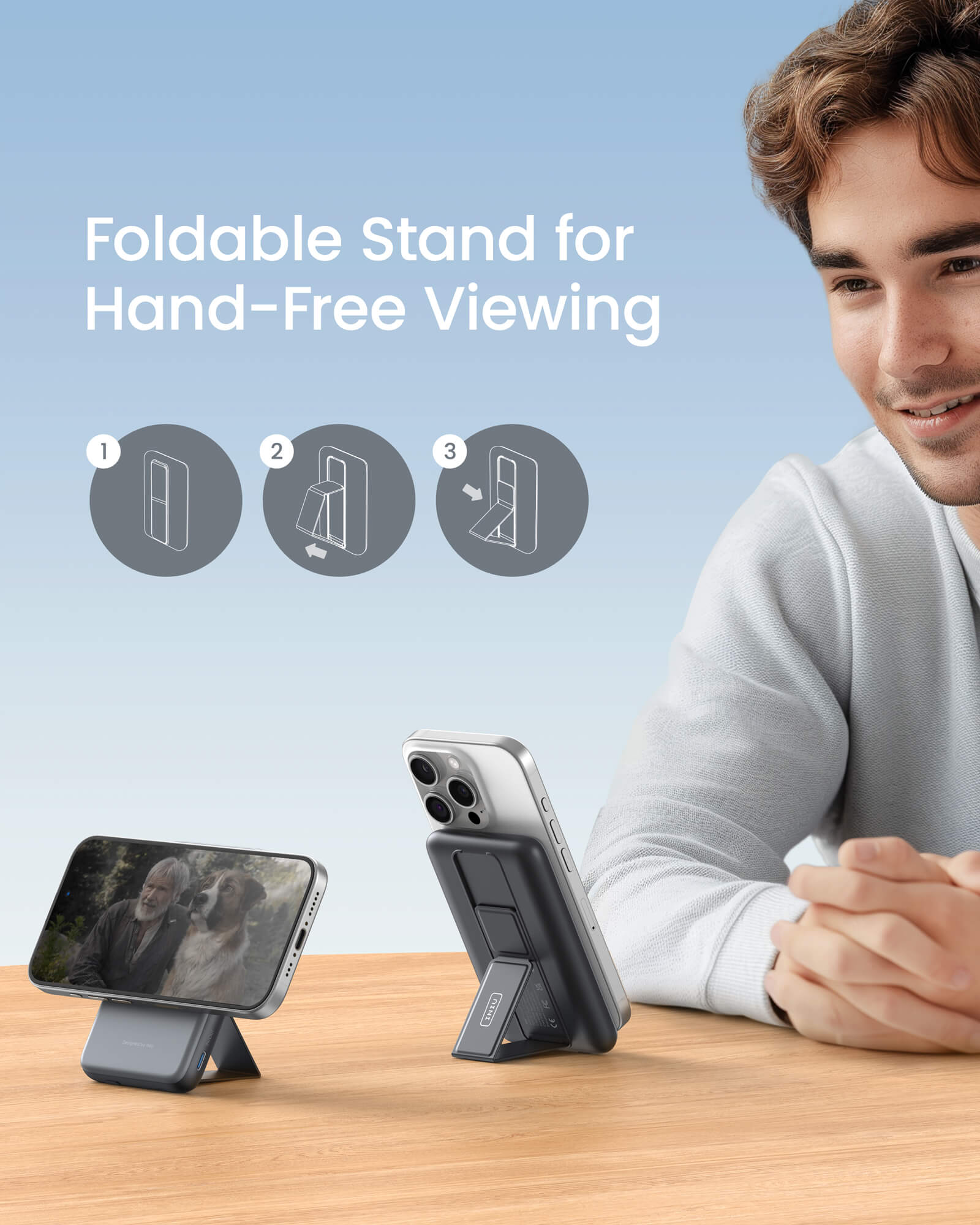 - [Wygodna wbudowana podstawka] Masz dość trzymania telefonu podczas oglądania filmów lub prowadzenia wideorozmów? Nasz powerbank jest wyposażony w składaną podstawkę, która podtrzyma Twoje urządzenie podczas użytkowania, zarówno w podróży, jak i w domu.