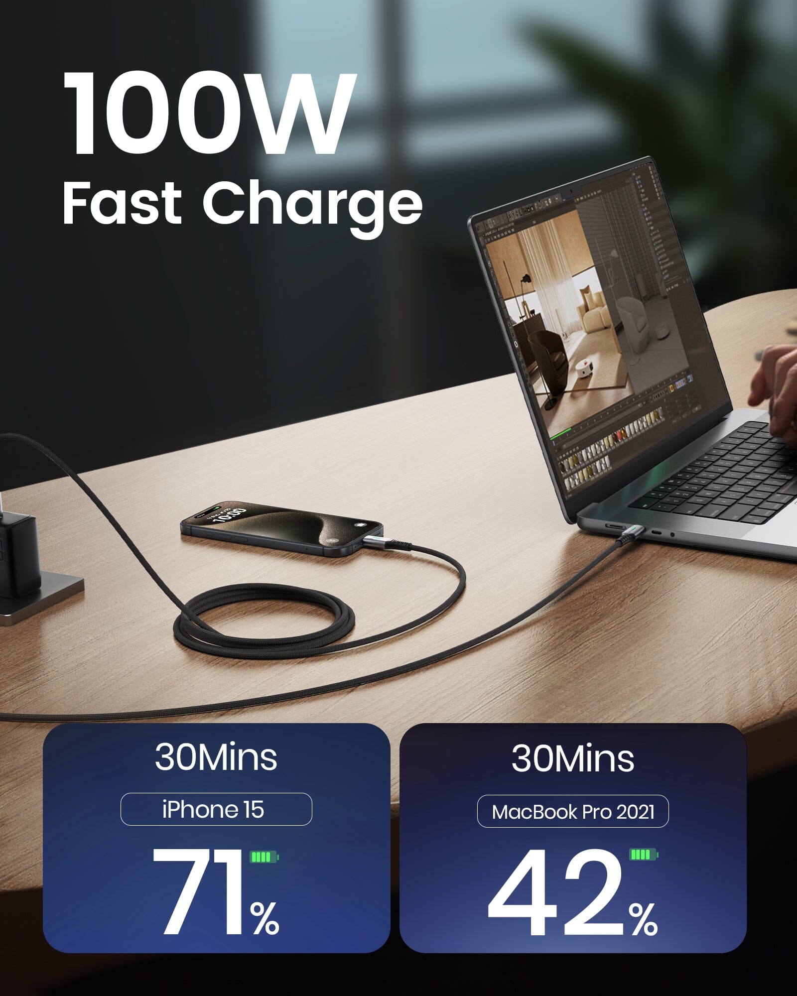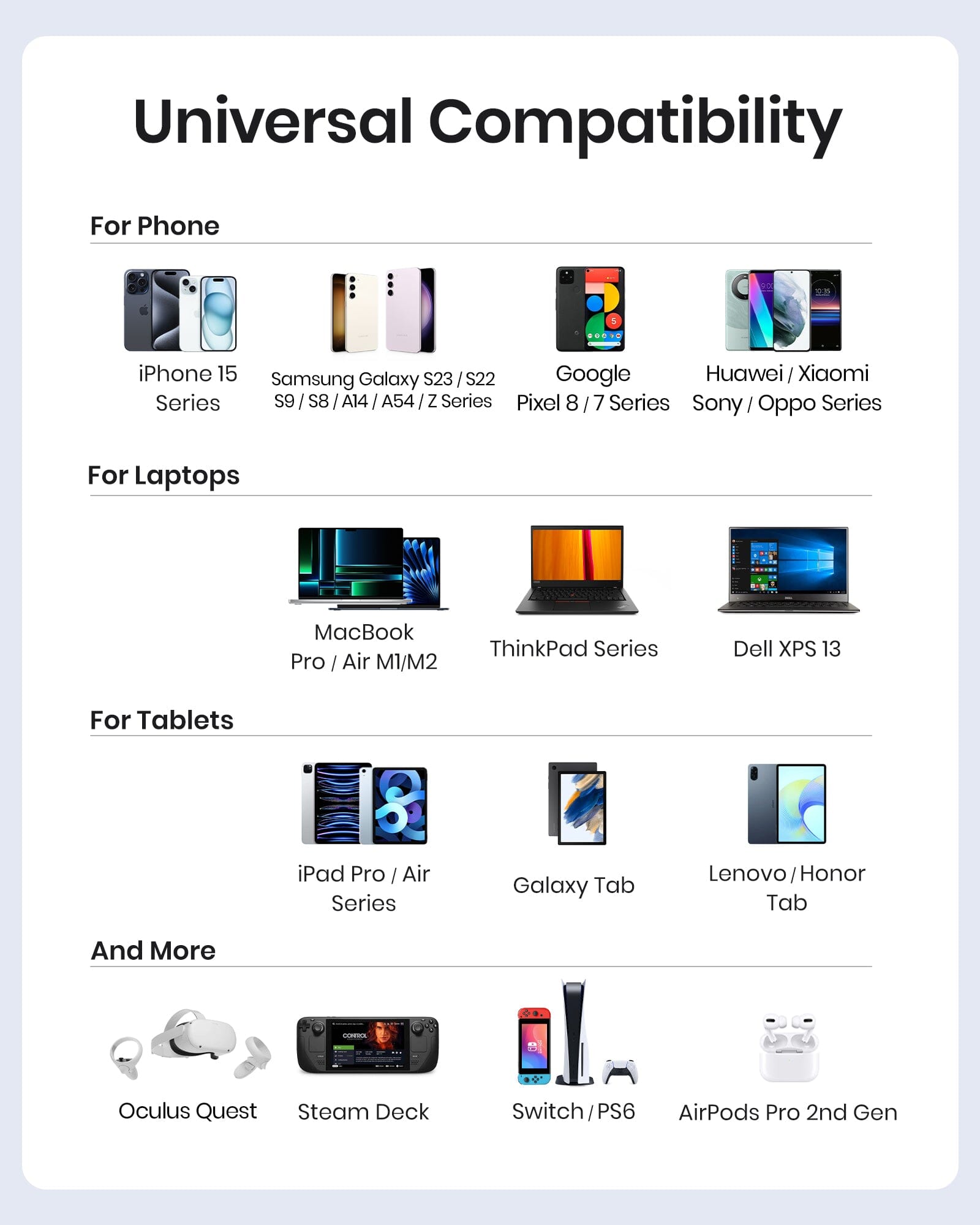 WAŻNY:1. Użyj oryginalnej ładowarki lub szybkiej ładowarki PD 3.0/2.0. 2. Twoje urządzenie obsługuje szybkie ładowanie. Największa prędkość: MacBook Air/Pro 14"/15,4"/13,3", Dell XPS 13, Lenovo ThinkPad X1, HP Spectre, iPad Pro/Air/mini, Samsung S9-S23/Note 8-10,Pixel 3-7,Switch/SteamDeck; Ograniczona prędkość: MacBook Pro 16" 2021, Dell XPS 15