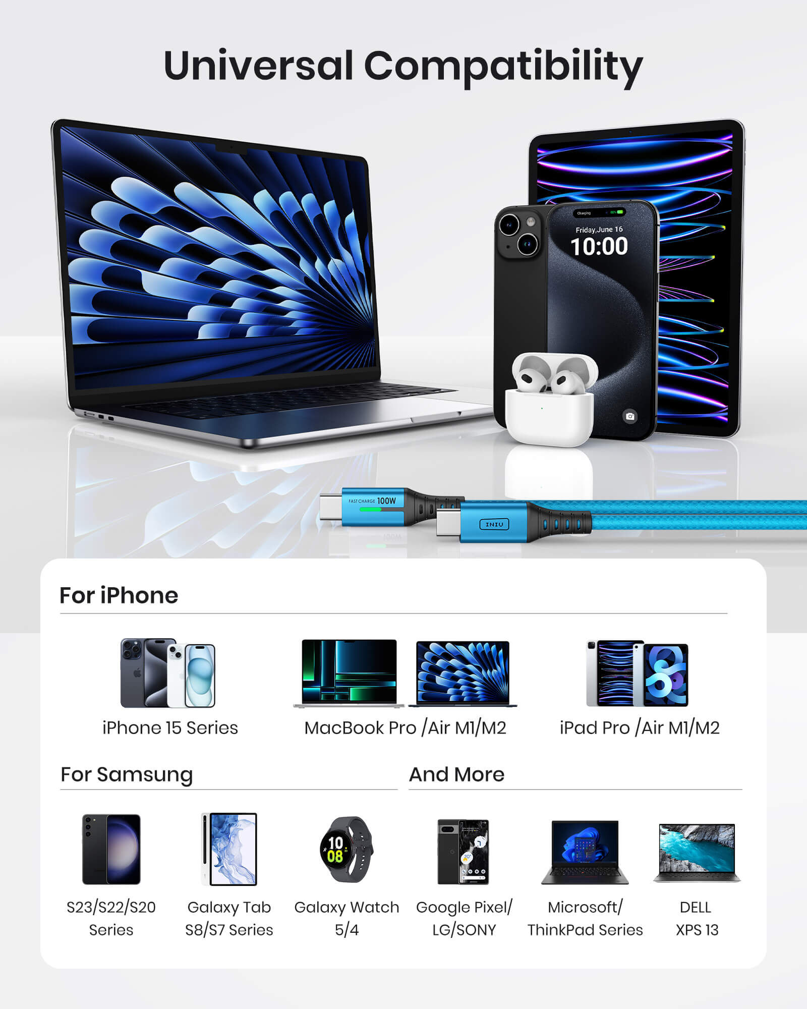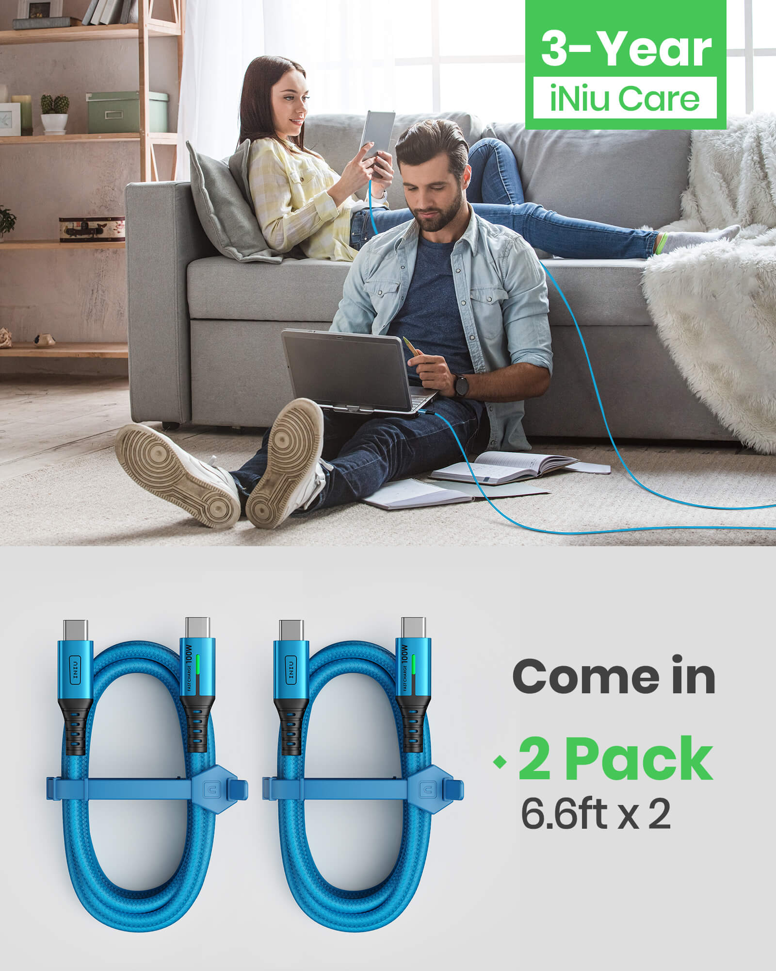 INIU D5CC USB C to C Cable Blue 100W (6.6ft, 2-Pack),Compatible with iPhone 14 13 12 Pro Samsung S21 Google LG iPad Tablet, etc.