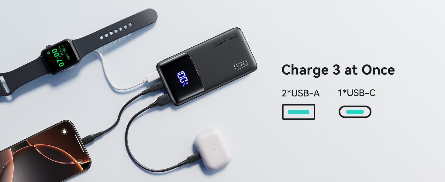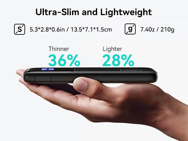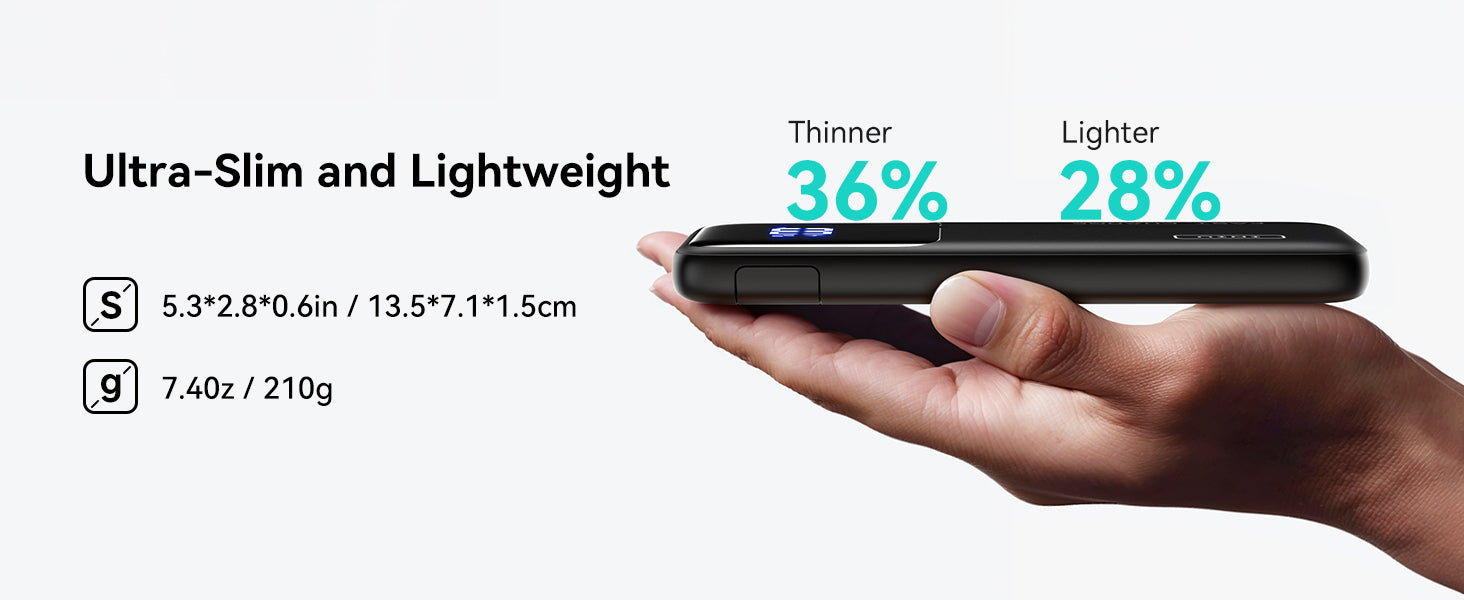 - [Ultra Portable Design]The capacity of 10,000mAh is stored in an incredibly slim body that is 36% thinner, 15% smaller, 28% lighter than its kinds. You can easily take it anywhere without feeling bulky and heavy.