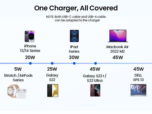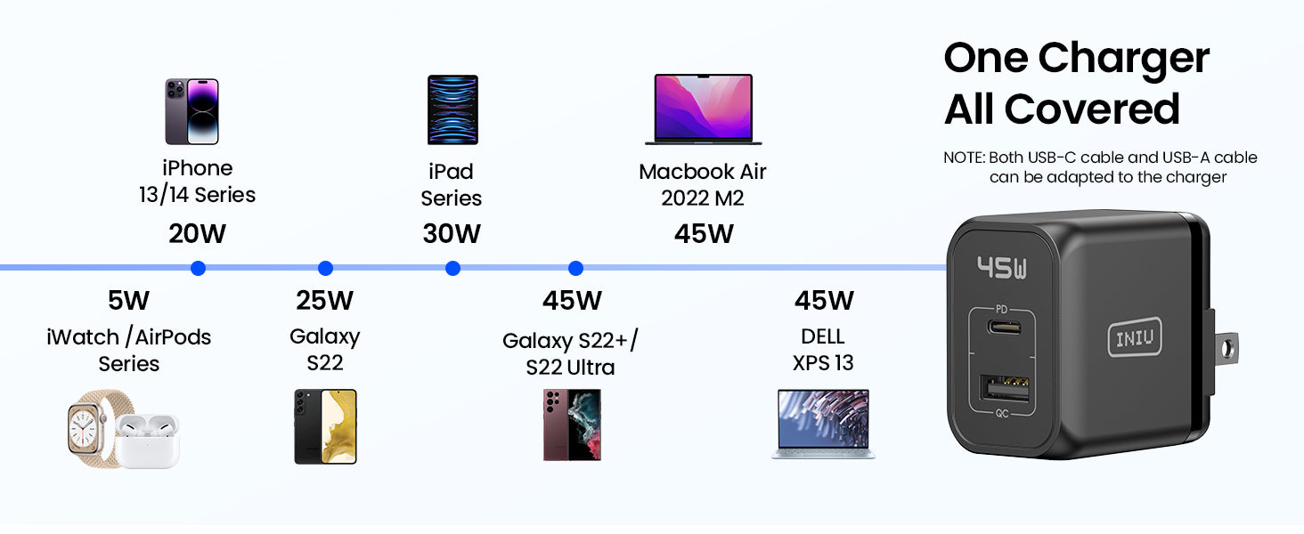 - [GaN 45W 每次充電速度加快]GaN 45W 可滿足最新設備的最大功率需求,為 iPhone 15 提供高達 71% 的電量,或為三星提供 S23 Ultra 僅需 30 分鐘即可充滿 52%,MacBook Air 充電 1 小時即可充滿 41%——而其他 20W 充電只能達到 37%。