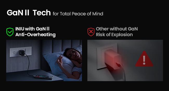 INIU 專有的 GaNⅡ 技術可透過每天超過 320 萬次的智慧溫度監控來保護您和您的設備,使您和您的設備免受火災和電池損壞的威脅。