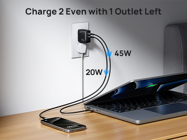 - 【同時快速充電】 不要等待輪到你!即使只有一個可用插座,我們的充電器也可以同時為 2 台裝置供電。不再需要排隊充電,只有純粹的便利。