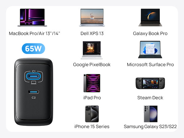 - [65W 快速供電,適用於所有手持裝置] 這款充電器的最大輸出為 65W,可全速為您的所有便攜式設備充電 - 無論是智慧型手機、平板電腦,還是像 SteamDeck 這樣耗電的設備。體驗極快的充電速度。