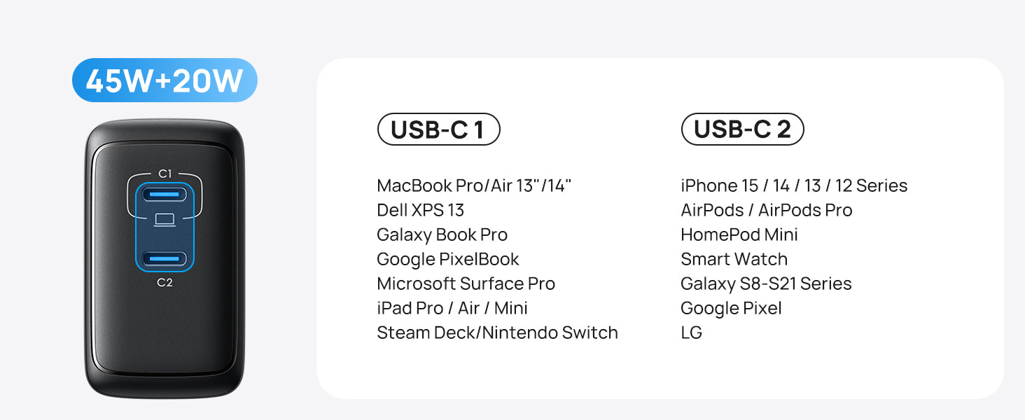 - 【緊湊、節省空間】 我們設計的這款充電器比舊款 65W 單埠 USB-C 充電器小 50%。它完美適合任何空間,確保您始終保持充電狀態而不會佔用太多空間。