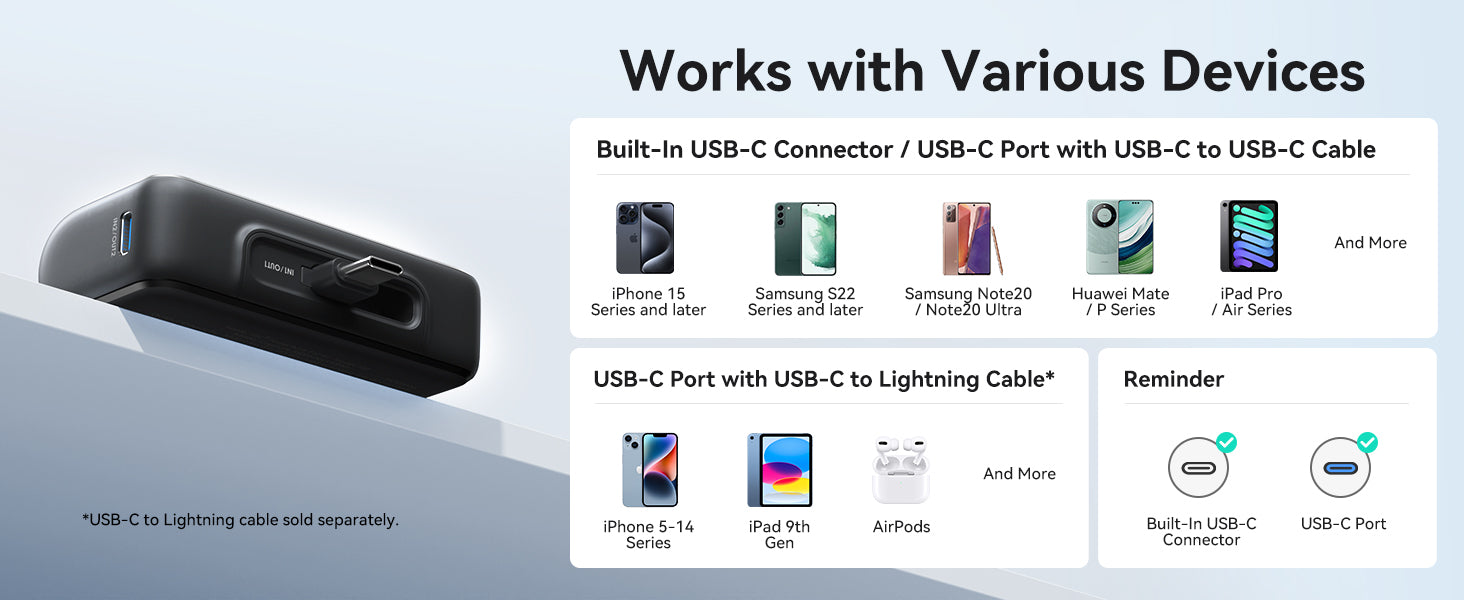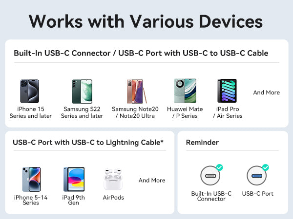便攜式 USB-C 充電:使用 USB-C 連接埠和連接器,您可以同時為兩個裝置充電,或透過直通充電技術在裝置充電時為其充電。